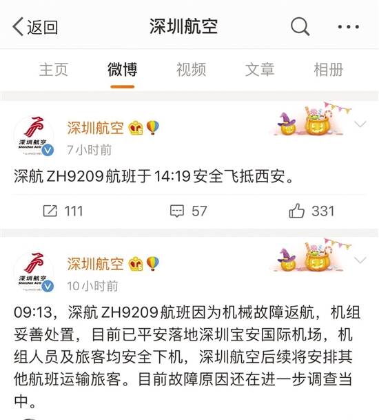 ■深圳航空昨日在官微发布关于发生机械故障返航的深航ZH9209的相关通报,指出故障原因还在调查中。 |