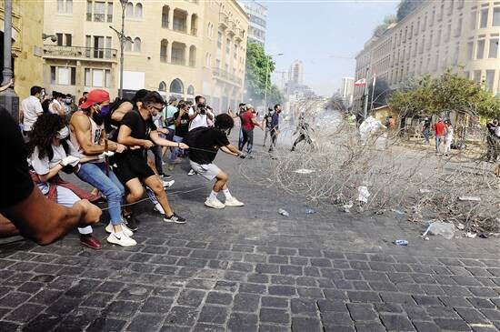 ■8月8日,示威者拉开铁丝网试图进入黎巴嫩议会大楼所在区域。新华社发 |