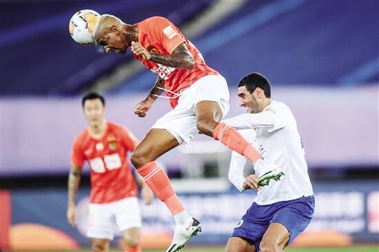 ■恒大队球员塔利斯卡(上)与山东鲁能队球员费莱尼(右)争抢头球。新华社发 |