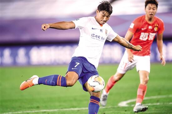 ■为山东鲁能队进球的郭田雨(左)。 |