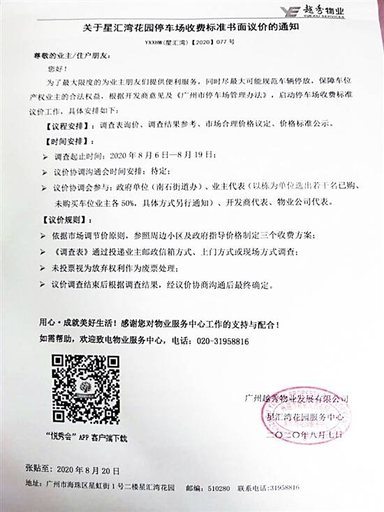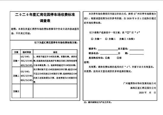 小区停车场取消月保遭业主反对 星汇海珠湾的一名业主陈萍(化名)告诉记者,上周末,小区物业公司在一楼大堂的公告栏处粘贴了一份关于停车场收费的通知,调查表仅给出了两种临时停放的收费标准,“没有月保,意味着业主开车回家一次,就要被收一次钱。” 在位于海珠区广纸路的星汇海珠湾小区,记者看到了小区物业给出的停车场收费标准调查表中,方案一的收费为4元/小时,20元/12小时,40元/24小时;方案二则为8元/小时,40元/12小时,60元/24小时。连续停放超过半小时的车辆,计费时限不足1小时的按1小时计算;超过5小时不足12小时的按12小时限价计算,连续停放12小时的按上述标准累加计算,连续停放24小时限价收费。 收费标准一出,引起不少业主的反对。陈萍告诉记者,星汇海珠湾去年12月收楼开始入住,“购房合同上并没有约定停车场收费,可这份新的收费标准,没有跟业主有过任何协商。” 记者采访中,正好遇到有业主在填写提交调查表,有的业主勾选方案一,有业主在空白处自报新的收费——月保。当业主陈萍准备填写时,物业管理公司工作人员表示,调查表的物业公司落款写错了,“目前暂不能填写,登记一下,到时工作人员上门。” 开发商曾给出1000元月保方案 记者在采访时了解到,该小区因为停车场收费问题,业主曾在几个月前和开发商协商过一次。今年5月20日,开发商提出一份车位租售方案,内容显示未出售的车位将进行月租、临租,月租价格为每个月1000元,临租价格为8元/小时,12小时最高限价40元,24小时最高限价64元。 “月保1000元,不少业主觉得较高。”另一业主张诚(化名)告诉记者说,当时有不少业主拨打12345热线反映问题,有业主收到短信答复,内容显示开发商公示的《星汇湾花园车位租售方案》中的出租条款,属于征求业主意见,公示期内手机各方关于车位出租价位的意见,将作为下一步协商议价的参考,公示期后,开发商和物业管理公司仍需按相关条例进行协商议价。 南石头街道办当时表示,将督促物业管理处在公示期间征求业主意见后,按照《广州市停车场条例》和《广州市住宅停车场机动车停放服务收费协商议价规则》进行指导和协商议价。 张诚对记者说,在6月份时,海珠区南石头街道办、开发商共同组织了业主召开了协调会,可当时关乎月保价格,并没有得出结论,“没想到过了两个月,停车场直接没了月保这一方式。” 物业回应: 仍在收集意见阶段 为何停车场新收费标准的方案里,只有临保,取消了月保? 对于陈萍等业主的疑虑,小区物业服务中心的周经理答复业主称,并不是取消月保,目前只是在收集业主意见,“业主有什么意见,都可以提出来,到时再汇总,并不是最终的收费方案。” 对于小区停车场这一新收费标准,有业主认为,取消月保只有临保,业主停车的费用就会上升,物业希望以此提高车位的售卖率。新快报记者在该小区的地下停车场负三层看到,只有少部分车位表明“已售卖”,大部分车位均是空的,尚未出售。 就业主反映的问题,新快报记者陪同业主前往南石头街道办,街道办一名工作人员答复业主称,街道办作为指导单位,业主可以表达自己的意见,“意见收集完了,到时会召开讨论会,开发商、街道办、业主代表都会在场,最后才能确定收费方案。”
