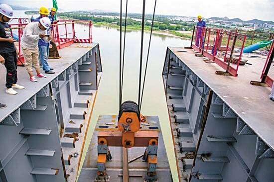 ■南沙港铁路跨西江斜拉桥顺利合龙,它是目前世界双线货运铁路建设史上同类型结构跨度世界之最。通讯员供图 |