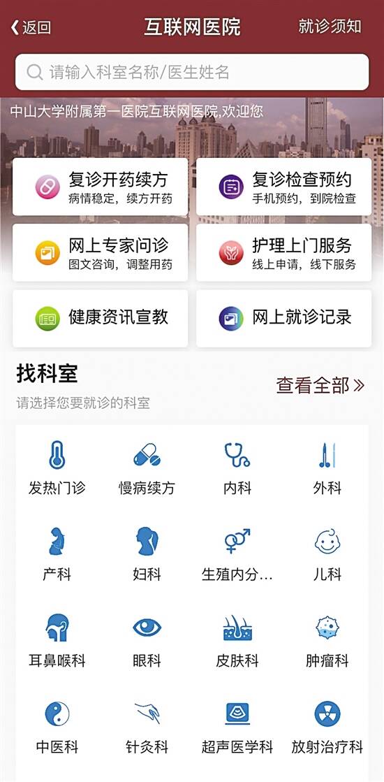 患者只需下载“掌上中山一院”APP,里面有入口可以进入互联网医院。目前,中山一院互联网医院已上线网上专家问诊、复诊开药续方、复诊检查预约、护理上门服务、健康资讯宣教等模块,实现了医护患线上多形式交流互动,为患者构筑智能全流程健康自助服务的线上线下一体化诊疗新模式。 患者在互联网医院上可利用文字、图片、语音等交流方式与专科医生、药师、护士或医技人员进行沟通互动,申请报告解读、咨询指导等,同时也提供音视频、虚拟电话咨询,患者缴费一次后可享受3次问诊机会和48小时的咨询时长,实现了高科技加持下的多样化、全方位智能医疗服务。 除了看病足不出户外,患者开药取药少跑腿也逐渐成为了互联网医院的就医新常态。中山一院互联网医院创新药学服务模式,开通了“互联网+药学”惠民服务,复诊患者在互联网医院就诊后,医生、药师可通过网络平台为复诊患者书写病历并下诊断,同时开立药品处方,药品可线下药房自提,也可通过药房提供的配送服务,直接送药上门。 此外,互联网医院还提供复诊检查预约功能,复诊患者可预约医生为其开具检验检查申请单,同时自行线上预约检验检查项目的具体日期及时间。 当前,中山一院互联网医院汇聚了547位名医专家“坐诊云端”,涵盖了内科、外科、妇科、儿科、神经科、肿瘤科、心血管科、康复医学科等三十多个专科,其中,名专家6人,副高以上专家328人,占出诊专家半数以上,同时,互联网医院还提供护理、药师等全面专家咨询服务。