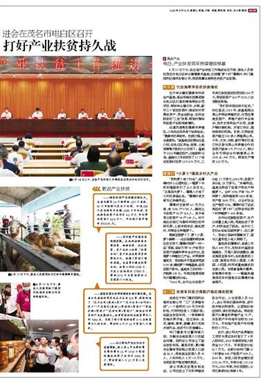 亮点产业 电白:产业扶贫筑牢持续增收根基 8月17日下午,在全省产业扶贫工作推进会召开前,参会人员前往茂名市电白区林头镇澳寒羊基地、沙琅镇“萝卜村”谭儒村、岭门镇冠利达海洋生物公司,现场观
