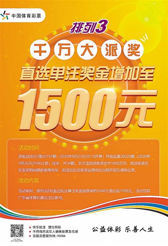 该活动在排列三第20187期(2020年8月23日20:10开售)开始至第20220期(2020年9月26日20:00止售)结束,共34期。本次活动派奖资金共1000万元,如果派奖资金在派奖期间提前使用完毕,则活动在派奖资金用完的当期开奖后提前结束。派奖期间,排列三游戏直选玩法单注奖金由原来的1040元增加至1500元,奖励标准如下: 奖级中奖条件活动前奖金活动期间奖金 直选投注号与中奖号相同且顺序一致1040元1500元 组选三中奖号任意两位相同 投注号与中奖号相同且顺序不限 346元346元 组选六中奖号三位各不相同 投注号与中奖号相同且顺序不限 173元173元 本次活动仅限广东省内体彩投注站参与 排列三是体彩经典游戏,是指从000-999的数字中选取1个3位数作为一注投注号码进行的投注。每注金额人民币2元。按照不同的投注方式,它有直选投注、组选三、组选六等投注方式,奖金分别为1040元、346元、173元。此次派奖活动把直选投注奖金提升到1500元,没有套路,可谓简单直接。