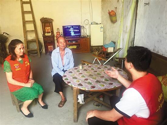 ■冼东妹(左)与迳口镇扶贫干部李智宇(右)到贫困户郑伙有(中)家走访。 |