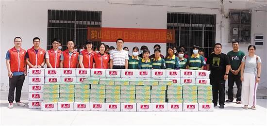 ■福彩工作人员为环卫工人送上清凉慰问品。 |