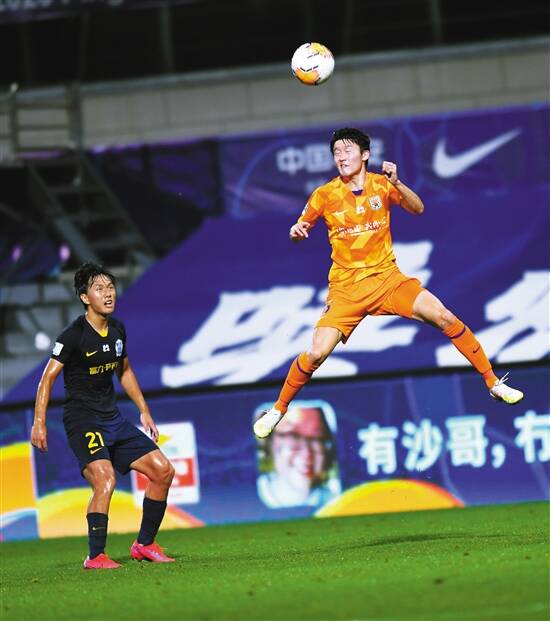 ■山东鲁能泰山队球员王彤(右)在比赛中头球解围。此役富力再度吃亏于高空球。新华社发 |