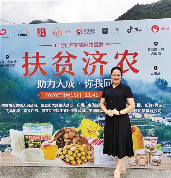 ■信宜市省级电子商务进农村综合示范项目已经落户大成镇。图为消费扶贫网络直播销售负责人苏金兰。 |