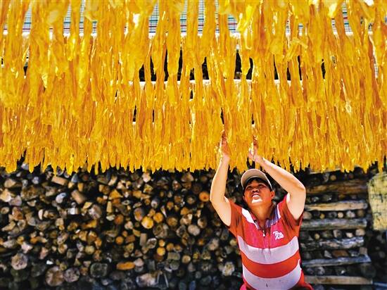 ■河源市东源县三洞村,贫困户钟旺华在帮扶下,开起了腐竹家庭作坊,走出往昔困顿步入幸福小康。图为其妻子在晒腐竹。 |