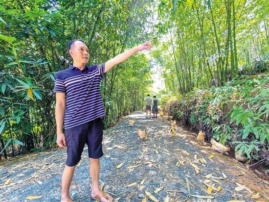 ■邓志勇自建了竹林养鸡场,通过对村民和贫困户的“传、帮、带”,一起把桂林村土鸡、土鸡蛋的招牌越做越大。 |