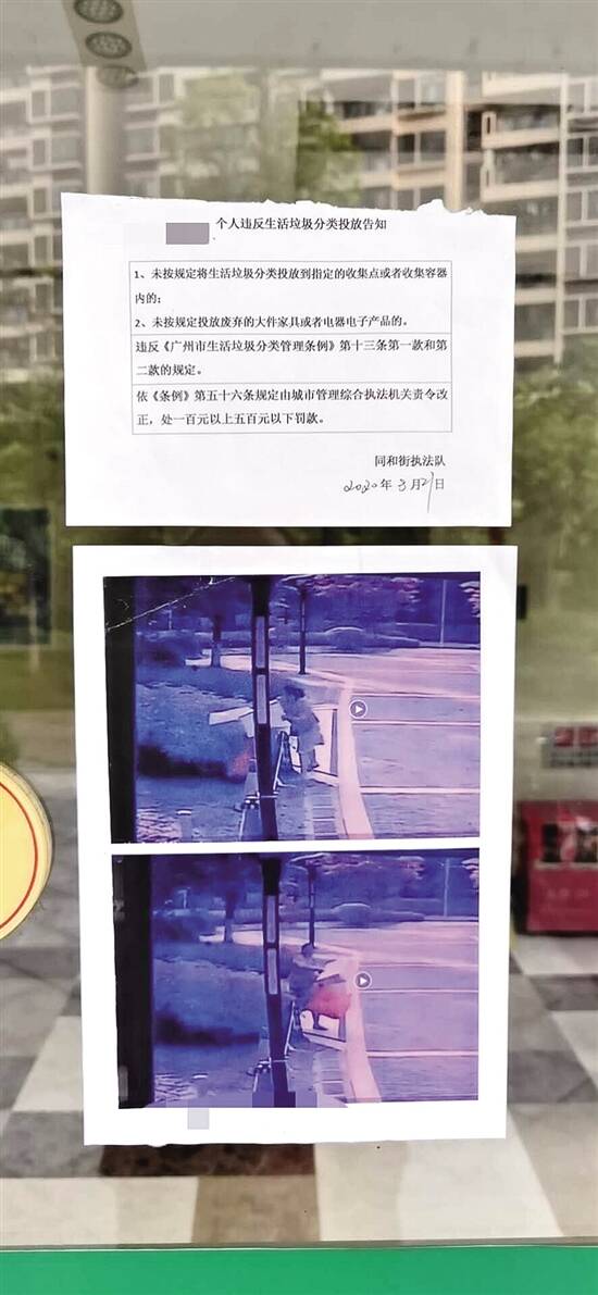 ■新快报记者 林钢威 实习生 吴昊天 “在楼下乱扔垃圾是我不对,我接受处罚也进行整改,保证今后不会再乱扔垃圾。但是街道执法队把我的照片贴在楼下大门进行公示,侵犯了我的肖像权。”谈起在楼下乱扔垃圾一事,广州的黄女士既是羞愧,又是气愤。她认为同和街执法队的处理方式有失妥当。 新快报记者从黄女士提供的白云区城市管理和综合执法局开具的《广州市城市管理综合执法责令限期改正通知书》了解到,黄女士乱扔垃圾的行为违反《广州市生活垃圾分类管理条例》(下称“《条例》”)第十三条规定,责令她立即停止违法行为,并于8月27日前整改完毕。贴在楼下玻璃门的是同和街执法队开具的《个人违反生活垃圾分类投放告知》,上面清楚写明了黄女士的房号及姓名,称其违反《条例》第十三条第一款和第二款规定,依第五十六条规定由城市管理综合执法机关责令改正,处一百元以上五百元以下罚款,并且还在下方附上了黄女士乱丢垃圾时的监控照片,并再次标明其房号和丢垃圾时间。 黄女士表示,在此扔垃圾的并不止她一人,只有她被公之于众,更让她欲哭无泪的是,这张照片及《个人违反生活垃圾分类投放告知》还被发到业主群上,对她的影响很大。目前,该照片已经被她撕下。 为何会在此处扔垃圾?黄女士坦言,“还没有养成习惯”。 8月28日下午,记者来到御岭山庄物业管理处,经理助理陈小姐称,监控照片和告知书是同和街执法队贴的。物业工作人员也曾向黄女士讲过不要乱扔垃圾。 小区物业和街道执法队回应新快报记者称,该小区正在推进全域环境整治,创文明城市和垃圾分类工作,对随意倾倒垃圾的行为作出相应的处理措施。此前社区居委会、派出所片警以及物管公司先后5次上门对涉事业主进行劝导。同时,对该业主乱扔垃圾行为,小区物管也做了劝导和沟通,但该业主一直不予配合。 白云区同和街执法队教导员马淑莎表示,监控照片由物业提供,执法队工作人员把照片粘贴在玻璃门上,是双方共同作出的行动。 针对涉事业主投诉被贴照片侵犯其肖像权和隐私权时,同和街道执法队也坦言,今后他们将继续加强对垃圾分类工作的推进,巩固创文成果,积极回应小区业主关切的问题,同时也会更加注意方式方法,提高工作效能。 广东保典律师事务所合伙人、公益律师廖建勋接受新快报记者采访时表示,街道执法队及物业在楼下贴有黄女士的监控照片,侵犯了黄女士肖像权和隐私权。执法队和物业应承担侵权责任,黄女士可以要求他们承担停止侵权、消除影响等责任。