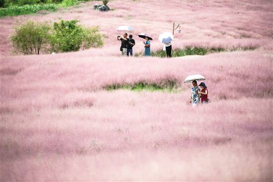近日,贵州省黔南布依族苗族自治州长顺县神泉谷景区内的粉黛乱子草进入盛开期,成片的“粉色海洋”吸引众多游客前来观赏游玩。新华社发