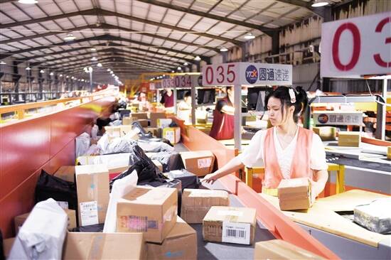 ■在圆通速递建包仓,工作人员扫描电商快件。 新华社发 |