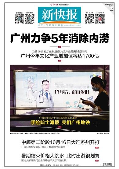 广州力争5年消除内涝 03 动漫、游戏、数字音乐、直播、电竞产业规模排全国前列 广州今年文化产业增加值将达1700亿 06 中超第二阶段10月16日大连苏州开打 分争冠组和
