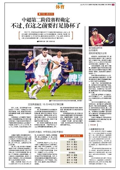 ●中超·最前线 [昨天下午,中国足协在苏州赛区召开了中超俱乐部总经理会议。会议上,有关中超第二阶段的赛制被正式确定,由于亚冠联赛被进一步延期,中超第二阶段可以提前到10月中旬开战,赛区依然是大