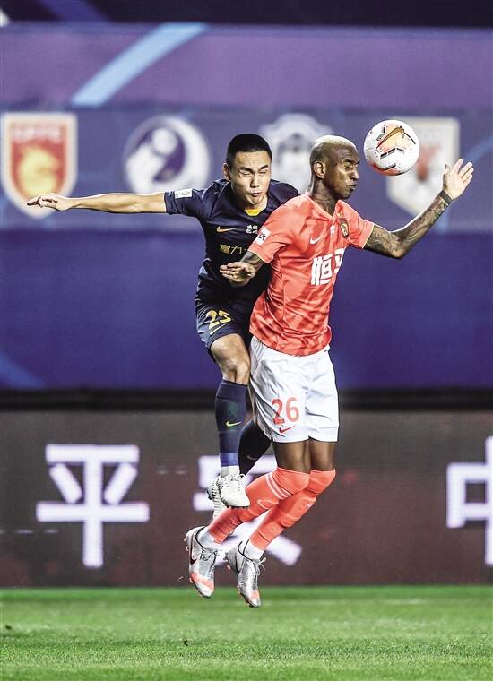 ■广州恒大淘宝队球员塔利斯卡(右)与广州富力队球员陈哲超争顶。新华社发 |