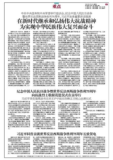 据新华社电 中共中央、国务院、中央军委3日下午在人民大会堂举行座谈会,纪念中国人民抗日战争暨世界反法西斯战争胜利75周年。中共中央总书记、国家主席、中央军委主席习近平发表重要讲话强调,中国人民在抗
