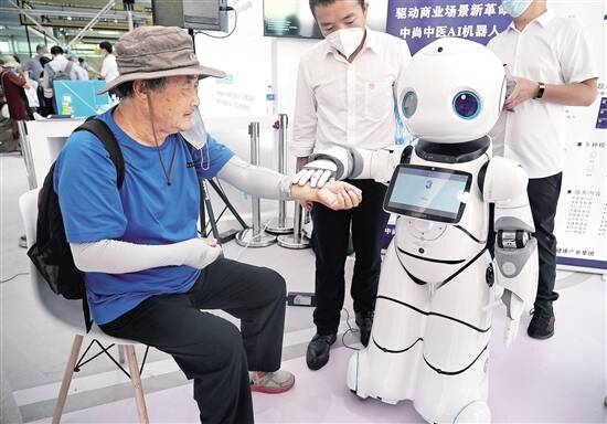 ■9月7日,在服贸会服务机器人专题展区,一款中医AI机器人为观众把脉。这家企业的中医AI机器人可通过中医诊断方式与人交互,并提供体质检测、健康咨询等服务。新华社发 |