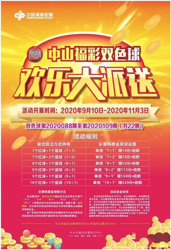6种复式获等值购彩金 本次活动时间为双色球第20088期(开奖日为2020年9月10日)至第20109期(开奖日为2020年11月3日),在中山市内福彩投注站采用且仅限于“7个红球+1个蓝球(7+1)、7个红球+2个蓝球(7+2)、8个红球+1个蓝球(8+1)、8个红球+2个蓝球(8+2)、9个红球+1个蓝球(9+1)或10个红球+1个蓝球(10+1)”六种复式投注双色球游戏彩票(倍数不限)且中奖的,在兑取中奖奖金的同时返还与该张彩票投注金额相等的购彩金。 但要注意的是,参与活动的彩票必须是在中山市内福彩投注站购买,并在中山市内福彩投注站兑奖,才可获得相应的活动赠送购彩金。在广东省内其他地市购买的彩票或在中山市内购买但到其他地市兑奖的彩票不能获得本次活动赠送购彩金。 150万元资金派完即止 本次活动安排资金约150万元。在活动期间,如当期双色球开奖后,符合赠送购彩金条件的彩票总赠送资金达到140万元,本次活动将在次期双色球销售结束后停止,本次活动结束;如双色球第2020109期开奖后,符合赠送购彩金条件的彩票总赠送资金仍未达到140万元,本次活动将顺延至下一期,直至总赠送资金达到140万元的次期双色球销售结束后停止,本次活动结束。 本次活动赠送购彩金在彩民兑奖时一并领取,符合赠送购彩金条件且在兑奖有效期内的中奖彩票,领取购彩金截止时间为活动结束之日起7个自然日内,逾期未领视为自动放弃领取该彩票购彩金,敬请广大彩民留意。