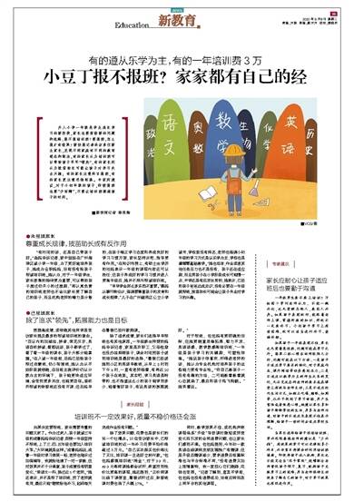 ■新快报记者 陈思陶 ●未报班家长 尊重成长规律,拔苗助长或有反作用 “有时间的话,还是自己带孩子好。”垚妈告诉记者,家中姐姐在广州海珠区读小学一年级,为了更好地培养孩子,她成为全职妈妈,目前没有给孩子报读培训班。她认为,对于一年级学生,家长密集的陪伴更为重要,可以帮助孩子渡过幼升小的过渡期,“再认真负责的培训班老师也不会比家长更了解自己的孩子,而且机构老师的精力是分散的,在孩子端正学习态度和养成良好的学习习惯方面,家长坚持示范、指导更有作用。”在知识传授上,有硕士生学历的汪妈表示一年级的课程内容还可以胜任,但孩子养成好的学习习惯并进入更高年级后,她并不排斥报读培训班。 “早早学会那么多东西不重要。”蔡妈从事刊物设计,强调要尊重孩子的发育和成长规律,“儿子在广州越秀区公立小学读书,学校里没有排名,老师也强调小初年级的学习方式是以乐学为主,学校也是遵循零基础教学。”她也坦言,作业或者其他任务压力也不是没有,孩子还在适应期,而且男孩子在小学阶段成长可能慢一点,中学还是有后发优势的,她表示,已经和孩子爸爸达成共识,没有必要在一年级就报班,拔苗助长可能会让孩子失去对学习的兴趣。 ●已报班家长 除了追求“领先”,拓展能力也是目标 想提高成绩、或领跑其他同学是受访家长提及最多的报读培训班的缘由。“百以内的加减法、拼音、常见汉字、英语自然拼读、看图说话,孩子都学过了,看了看一年级的课本,孩子大部分能掌握。”在入读一年级前,吕妈已经给孩子报过启蒙班、幼小衔接班,她认为从开始阶段就领跑,在目前主流评价仍以分数为主的环境下,孩子能更快适应环境,会受到更多关注,也能更自信。虽然所报读的秋季班还没有开课,但吕妈早在暑假已经付款购课。 除了追求成绩,家长们选择早早报班也有其他原因。一年级新生梓萌的妈妈告诉记者,家里是双职工,父母祖辈也没办法照顾孩子,课余时间把孩子送到培训班是最好的选择,“暑假已经送她到小区的英语早教班,从早上8时到下午6时,一直有老师陪着,有将近20个孩子在班里。其实吧,学习英语是附带的,也不指望这么小的孩子能学到多少,能看管好孩子,有说英语的氛围就好。” 对于报班,包包妈有更明确的目标,但她更侧重思维拓展、智力开发、英语语感、数学数感等培训班,“一年级是孩子学习的关键期,可塑性很高。”她说孩子很喜欢、听得进老师的话,她认为专业机构对培养孩子的这些能力更有专业性。“你自己教孩子一没有有趣的方法,二可能教着教着就心态就崩了,最后和孩子鸡飞狗跳。”她笑着说。 家长经验 培训班不一定效果好,质量不稳价格还会涨 如果决定要报班,家长需要考量的问题又来了。作为过来人,孩子就读三年级的成睿妈妈告诉记者,即使一年级坚持不报班,上了三、四、五年级也要加入培训大军。“大环境就是这样。”成睿妈妈说,成睿一年级时学习表现一般,老师也暗示过加强辅导,我就给他请了一对一家教,但对效果并不十分满意,孩子成绩没有明显变化,“单语文一科,换过近5个老师。”她还表示,并不是报了培训班、找了老师就有用,最后只能“继续给他补习,起码每天完成作业没有问题。” 除了效果问题,花费也是家长们的另一个吐槽点。10位受访家长中,已报读培训班的近一年补习花费平均价格超过3万元。“自己买衣服买包价格比了又比,培训课一旦选好立刻付款。”包包妈感慨培训班“消金”,对于9.9元、49.9元等网课她都会试听,希望找到性价比更高的课程,她还提到,“正价网课比线下课便宜,暑假试听过后,秋季班课时费也涨了大概17%。” 同时,教学效果不佳,或机构声称课程体系“升级”导致课时缩短或师资变化而引发的合同退费问题,也让家长们感到不满。包包妈提到,今年初一款英语在线课转发朋友圈推广有赠课,但是升级后赠课减少,要求退费后核算标准也与平台标准不同,“没有退费又加上疫情影响,我一度担心它们跑路,花钱也受罪。”记者了解到,直至开学前,包包妈也没有退费成功,协商后转而改上同平台的其他课程。