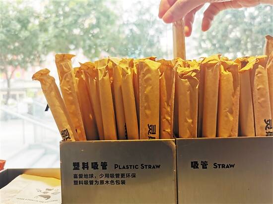 ■广州一奶茶店提供的塑料吸管,其外包装上写有建议顾客少用吸管的字样。 |