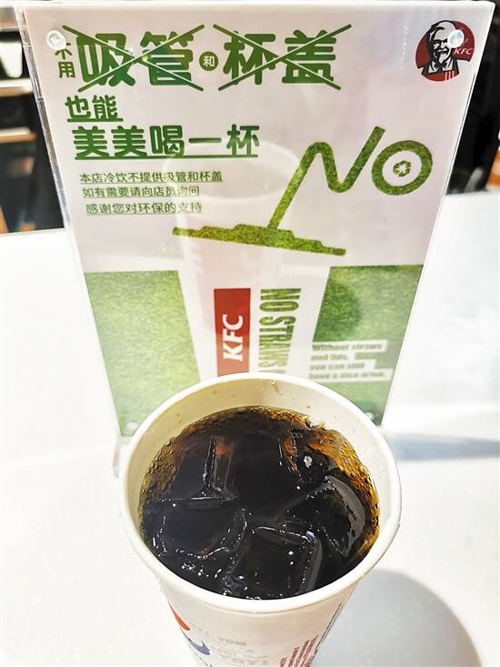 ■肯德基的点餐台上放着宣传牌,提示冷饮不再提供吸管和杯盖。 |