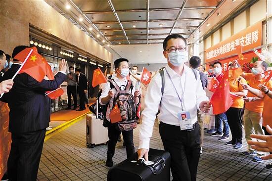 ■16日,圆满完成协助香港特区抗疫任务的支援队员,按广西、福建、广东三个来源地分批乘车离港。从酒店大堂一直到大巴,等候多时的香港市民们夹道欢送。新华社发 |