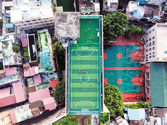 ■广州市第十中学位于老城区,校园被密集的居民楼包围,运动场地不足。2019年,该校在教学楼天台建成了一座“空中球场”,球场防护网、人造草皮、照明设备等一应俱全。新华社发