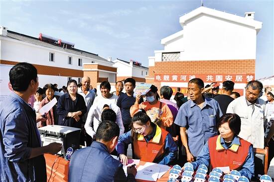 9月20日,在菏泽市鄄城县旧城镇六合社区(三合村村台),选房后王庄村村民在办理用电入户登记。 经过三年的规划建设,9月20日,位于黄河滩区的山东省菏泽市鄄城县旧城镇六合社区(三合村村台)、七街村台、大邢庄村台和安庄村台全部投入使用,首批迁建安置村民按照排号顺序,统一“选房”,准备乔迁新居。 2017年,山东省启动编制《山东省黄河滩区居民迁建规划》,通过外迁安置、就地就近筑村台、筑堤保护、旧村台改造提升、临时撤离道路改造提升等5种方式,到2020年底完成60万滩区群众的迁建安置。 新华社发