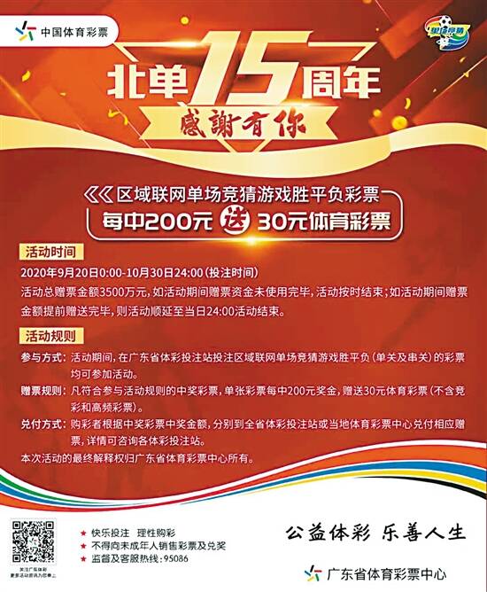 新快报讯 记者陆妍思报道 随着新赛季欧洲5大联赛全面开战,购彩者磨刀霍霍,足彩为你送实惠 。9月20日起,“北单15周年感谢有你”活动启动,区域联网单场竞猜游戏胜平负彩票,每中200元送30元体育彩票。 活动时间为2020年9月20日00:00-10月30日24:00(投注时间)。活动总赠票金额3500万元,如活动期间赠票金额未使用完毕,活动按时结束;如活动期间赠票金额提前赠送完毕,则活动顺延至当日24:00结束。 活动期间,在广东省体彩投注站投注区域联网单场竞猜游戏(即北京单场)胜平负(单关及串关)的彩票,均可参加活动。 凡符合参与活动规则的中奖彩票,单张彩票每中200元奖金,赠送30元体育彩票(不含竞彩和高频彩票)。