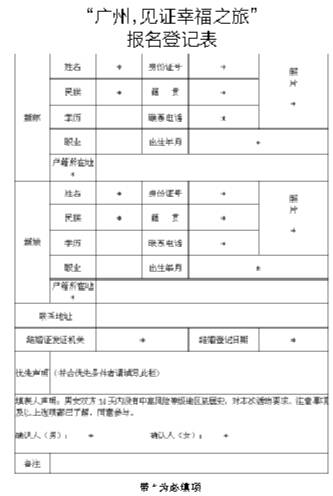 时维九月,序属三秋。此时,正是人世间的春华秋实之季。 是否是缘分把爱侣从南北两个城市牵引到广州相遇,又于无形之中在广州这座时尚、包容的城市里谱好了幸福结局?当爱侣们漫步广州,抬头是代表奋斗的高楼大厦,低头是温柔的骑楼旧色,在这个多彩的季节里即将又收获一年的欢喜。 为打造“婚庆+旅游”广州文旅新模式,将婚庆文化和旅游资源衔接,努力为“婚庆+旅游”的新业态提供示范。广州市文化广电旅游局拟于2020年9月29日举办“广州,见证幸福之旅”踩线体验活动。活动将面向全国各省、直辖市、自治区征集现处广州的32对夫妻,免费打卡广州精华景点,拍摄结婚纪念照,以此探寻“婚庆+旅游”的发展新模式,助推广州文化旅游产业升级,将广州打造成世界婚庆旅游目的地。 无论你们是来自哪里,只要广州记录了你们的相爱故事,就赶紧来报名吧!让见证幸福之旅记录下你们走在广州街头的时光和彼此靠近的欢欣喜悦。 即日起至9月25日,“广州,见证幸福之旅”征集来自外地的“新广”夫妇一同踏遍广州。本次活动面向全国各省、直辖市、自治区征集恩爱夫妻(14天内没有中高风险等级地区旅居史)。 活动公告 ●活动时间:2020年9月29日(周二) ●活动地点:广州 ●主办单位:广州市文化广电旅游局 ●协办单位:广州市民政局、岭南集团、广州塔旅游文化发展股份有限公司 ●活动性质:分享会及踩线体验游 ●报名时间:即日起至9月25日 征集优先对象 结婚未满一年的新婚夫妇、结婚十周年的锡婚夫妇、结婚二十周年的瓷婚夫妇、结婚三十周年的珍珠婚夫妇、结婚四十周年的红宝石婚夫妇、结婚五十周年的金婚夫妇优先。 时代楷模、道德模范、全国劳动模范、全国优秀教师等受到国家级表彰的英模;战疫一线医护夫妻;参加抗洪一线战斗的现役解放军、武警部队指战员夫妻等优先。 在抖音、微信公众号、微博、小红书等自媒体平台有粉丝经营运营者优先。 ★本次活动不收取任何费用。 ★成功入选的夫妇须出示身份证以及结婚证。 ★为了保证本次活动的真实性、有效性。要求所有参与活动人员必须填写本人真实完整的资料! 活动福利 ① 陪伴是最长情的告白——为金婚夫妇重温婚礼仪式。 ② 免费打卡世界最高摩天轮。 ③ 免费乘坐从广州塔至珠江琶醍的有轨电车—1314号。 ④ 免费拍摄结婚纪念照。 ⑤ 轻松玩转广州著名景点。 ⑥ 获得活动前天(2020年9月28日)的东方宾馆高级蜜月套房(含早)入住券。第二天将有免费大巴接驳。 报名方式 (1)拨打热线400-838-6161咨询 (2)发送附件回执邮件至1002147274@qq.com,附件请扫二维码获取