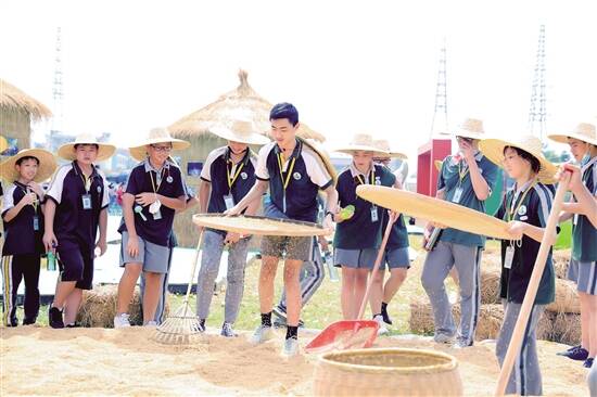 ■学生体验晒谷,感觉丰收的喜悦。 东莞市文化馆供图 |
