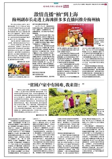 ■新快报记者 郑志辉 “好山好水出好柚,让我们一起为梅州柚点赞!”9月15日晚,由广东省农业农村厅和梅州市政府主办的主题为“柚到月圆时 柚到上海滩”的广东梅州柚黄浦江推介会在上海黄浦江翡翠公主号上隆重举行,梅州市人民政府副市长温向芳走进拼多多直播间,向上海和全国的网友倾情推介梅州柚,吸引了近50万网友围观。 据介绍,梅州是广东脱贫攻坚的主战场,梅州柚是当地的支柱产业之一。本次到上海进行线上线下推介梅州柚的活动,也得到了上海市农业农村委员会和广东省政府驻上海办事处等单位的大力支持。金秋9月,恰逢消费扶贫月,温向芳副市长在拼多多直播间表示,此次借助互联网新技术、新模式与网友互动,希望能让梅州柚在疫情后的特殊时期寻找新的发展机遇,擦亮梅州柚的金字招牌。 副市长直播试吃梅州柚 2020年5月20日,国务院扶贫办和拼多多联合启动“消费扶贫百县直播行动”,直播间一头连着扶贫产业,一头连着消费市场,助力扶贫产品开拓线上渠道销售。 梅州市山好水好生态好,拥有一百余年柚子栽培历史,光照充足、雨量充沛、红壤土酸碱度适宜,众多因素成就了梅州柚独特的品质。梅州是广东省最大的柚果产区、全球最大的沙田柚生产基地,被誉为“中国金柚之乡”“中国蜜柚之乡”。 据温向芳介绍,梅州柚的优良品质源于当地50%以上的富硒土壤,地下水源也有品质保障,这些造就了梅州柚独特的风味,“今年梅州柚大丰收,预计总产量超过93万吨。”坊间有言,不是每一只产自梅州的柚子都能叫梅州柚,温向芳解释,梅州市十分珍惜“梅州柚”的品牌,把符合条件、承认章程、履行义务和责任的种销企业组团到一起,筛选出最好的柚子包装进箱,统一Logo、统一品牌形象,不熟不采、非熟不卖、按质定价,让好的柚子卖出好价钱。“我们强调要用感情种柚子,要用激情卖柚子”,温向芳引以为傲。 拼多多助力梅州柚 提升品牌知名度 谈起梅州柚的发展现状,温向芳滔滔不绝、如数家珍。梅州柚对于梅州人来说,不仅是增收致富的来源,更是“世界客都·长寿梅州”的名片。 近年来,梅州市充分发挥龙头企业带动作用,把产业发展和产业扶贫相结合,创新帮扶模式,全力打好脱贫攻坚战,开展了系列联农助农产业帮扶工作,通过梅州柚公司+合作社+基地体验+订单销售的模式,推动产业发展,助力脱贫攻坚。 此次广东梅州柚黄浦江推介会采取线下活动和线上直播的形式,也是为了借助电商直播等新形式进一步打响梅州柚的品牌。梅州市副市长温向芳亲自为梅州柚代言,向拼多多50万网友推介了梅州柚的优势,让网友对梅州柚有了直观深入的了解。 拼多多2019年农产品销售额达到1364亿元,成为中国最大的农产品上行平台,预计2020年平台农产品销售额将突破2500亿元。数据显示,截至8月31日,拼多多市县长助农直播已超195场,超过360位市、县、区主要负责人进入助农直播间推介本地农(副)产品。今年2月以来,消费扶贫等各种助农活动已累计带动平台相关专区共计成交4.23亿单,卖出农副产品总计超过25.68亿斤。 “拼多多将紧紧围绕助力脱贫攻坚、大力推动消费扶贫的主题,积极协同地方政府特别是贫困地区,基于新电商模式优势开展助农活动,促进农副产品与市场需求有效对接,担当起国内最大农产品上行平台的社会责任。”拼多多新农村农业研究院副院长狄拉克表示。 ■上海黄浦江翡翠公主号邮轮上的拼多多直播间,50万人围观梅州柚。摄影:石头