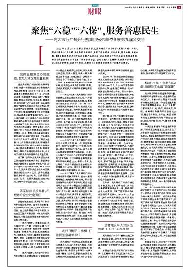 2020年9月24日,在第九届金交会上,光大银行广州分行以“聚焦‘六稳’‘六保’,服务普惠民生”为主题,联合集团兄弟单位,展现了阳光理财、社保名品、数字金融、跨境金融、普惠金融等具有光大特色的金融