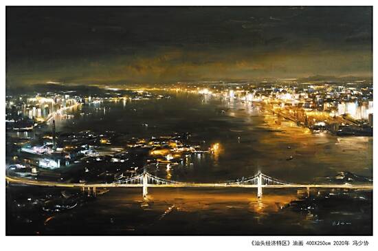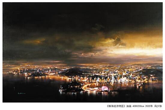 为庆祝经济特区建立40周年,“大美‘双区’——广东省庆祝经济特区建立40周年美术作品展”在广东美术馆展出,此次大展以大美“双区”为主题,分为逐梦先行、扬帆奋进、多彩画卷三大板块,共展出198件作品。广东美术家围绕特区主题创作了不少美术作品,其中广东画院的画家们更是特别创作了中国画《南国的风——深圳、珠海、汕头、厦门经济特区》、油画三联画《深圳经济特区》《珠海经济特区》《汕头经济特区》以及油画《深圳速度》等力作,作为“大美‘双区’——广东省庆祝经济特区建立40周年美术作品展”的重点作品在广东美术馆展出。 而其中由广东画院副院长、国家一级美术师冯少协创作的油画三联画《深圳经济特区》《珠海经济特区》《汕头经济特区》,通过分别表现三大特区的璀璨夜景,以浓墨重彩描绘了伟大的城市变迁,突出展现特区建立40年的辉煌成就。据悉,该展览广州展期将持续至10月10日。之后,展览将移至深圳市关山月美术馆展出。 从宏观的角度充分展现特区的经济实力和城市魅力 勇向潮头立,敢为天下先,是广东人特有的文化精神。40年来经济特区之“特”,就体现在通过国家设立的特定区域内进行经济体制改革和对外开放实践,让名不见经传的边陲小镇发展成为充满魅力、活力和创新力的国际化大都市,建设成为全国金融中心、科技创新中心、商贸物流中心、国际性综合交通枢纽,可谓是创造了举世瞩目的历史成就。善于以现实主义反映时代精神,擅长各类大型主题创作的冯少协,积极响应此次主题美术创作的号召,以其独特的艺术语言表现历经40年巨变的广东三大经济特区。无论是历史人物、典型事件还是经典地标,他总能找到一种图式能将时代的印记和内心饱满的热情在画布中无限延伸,让作品紧扣时代的意义,更让观众仿佛站在时代峰峦,感受到经济特区光芒四射、喷薄欲出的朝气,看到先行示范区的丰硕成果和面向未来的坚实步伐。 对于此次的献礼经济特区建立40周年主题创作,早在选题和构思阶段,少协先生有别于一般画家着力于表现时代英雄人物,重大历史事件或具体建筑地标等,而是另辟蹊径地、敏锐地选取表现深圳、珠海、汕头三大经济特区的璀璨夜景,以全景式的、宽银幕式的构图表现在绚丽灯光的点亮下特区的繁荣发展,从宏观的角度充分展现特区的经济实力和城市魅力。他以现实主义的创作手法和精湛的油画技巧,把特区的宏大场面组织在画面中。城市的流光溢彩、河流山川的辽阔高远、高楼大厦的耸立都在朦胧的夜色中尽收眼底,并巧妙地运用统一却丰富的色调创造了一个开阔的空间,同时,运用色彩的变化将层次空间无限延展,从而使画面具有深远震撼的空间感。画面中各种建筑景物的错落变化,以及地面城市的天际轮廓都经过精心设计,使观众体会到激昂壮阔的空间韵律。作品的总体色调变化和城市形象刻画都极有力度,而其中铿锵有力的笔触和强烈的明暗对比,又创造出震撼人心的视觉效果及意蕴无限的思想内涵。 开创当代油画关于城市夜景题材的进一步研究和探索 在整体色调方面的艺术表达以及极具个人辨识度的艺术表现性正是这一组画创作的成功之处。色域有浓淡、疏密、韵律的变化,且更多关注色彩的冷暖关系、色块面积的大小、节奏、虚实、明暗、厚薄、肌理等因素,进一步强化了画面色彩的象征性和视觉性。在城市夜景和灯光万变中形成协调统一的色彩关系,这无不显现出冯少协对色彩的个性化表达,他把对色彩的比较和分割布局都进行理性的分析,把握主色调的整体感,做到色彩变化丰富而和谐,在内心情感表达和画面组合的需求中建立新的色彩秩序,令这组经济特区系列作品带来强烈视觉冲击力和生命气息。 艺术创作的系列式是艺术家不断生发的创作欲的直接反映,也是他在相对稳定的创作模式中追求深层次拓展的有效进程。少协先生的油画艺术性格,总是遵循一种系列式的创作方式和理念,每当他站在画布前,就能激情澎湃。他的心中永远都充满了艺术发展的源动力,通过各种系列的主题创作,使自己的艺术风格不断升华,艺术语言不断精炼。正如中国美协原副主席许钦松先生所评述:“少协的时代题材创作,如《关注中国文化市场》《中东的鸽子》《百年广州》《海上丝绸之路》等系列作品,都定格于典型的人物刻画和历史场景,表现出艺术家独特的视点眼界,对时代人物的致敬以及对人类历史、命运的思考,更体现出这位艺术家对系列的世界性命题,所投入的实实在在的情感和心力。”今年以来,少协先生又以其敏锐的社会洞察力、艺术感受力以及倾注内心对这个时代的深刻情感,在短短的半年时间,创作完成了《新冠抗疫英雄》系列以及《经济特区》系列等多幅巨作力作。相比于他人,需蛰伏多时方有所获,少协先生于各类大创作却如云淡风轻,随手拈来。在他看来,这个不平凡的2020创作之年,却也看似一如往昔的寻常平凡。 艺术是时代的产物,艺术创作离不开特定时代背景、社会环境、人文情境。少协先生的三张经济特区夜景系列组画作品承载了他对深圳、珠海、汕头三大经济特区波澜壮阔的奋斗历程的史诗般概括。他不仅用绚丽多姿、美轮美奂的光的绘画语言来表现经济特区的夜景艺术之美与文化之美,并借此暗调子反衬特区欣欣向荣的时代精神;更