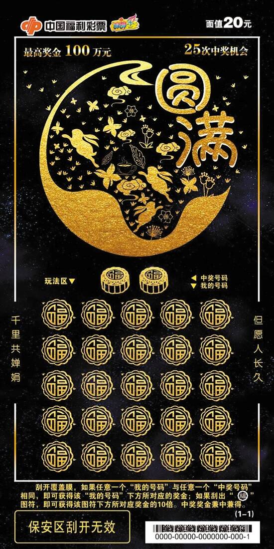 新快报讯 记者陆妍思 通讯员叶金鑫报道 花好月圆,金秋福满。近日,中国福利彩票为广大彩民朋友们亲情奉上刮刮乐新票“圆满”,该票全套共1张,每张面值20元,拥有25次中奖机会,最高奖可达100万元! 本款独具匠心的票面设计以中国传统节日“中秋佳节”为主题。浩瀚星空、圆月高挂,给人带来“仰头望明月,寄情千里光”的感怀;丹桂飘香、玉兔欢腾,让人升起“灏气才中兔魄圆,众躔韬彩独娟娟”的情愫。金色框线上的“但愿人长久 千里共婵娟”不仅为大家送上诚挚的祝福,还象征着中国福利彩票的好运和快乐伴您久久。票面玩法区的设计更是别出心裁,满满的金色“福”字月饼,寓意着月满人团圆,吉祥又甜蜜。两个中奖号码,更为彩民们的好运加倍,马上刮开涂层,“吃掉”月饼,找到那个属于您的幸运数字吧! 新票玩法趣味多,只需轻轻刮开覆盖膜,如果玩法区中任意一个“我的号码”与任意一个“中奖号码”相同,即可获得该“我的号码”下方所对应的奖金;如果刮出“福”图符,即可获得该图符下方所对应奖金的10倍。中奖奖金兼中兼得。