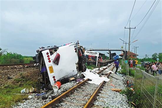 图 据新华社电 泰国中部北柳府11日发生一起火车与巴士相撞事故,目前已导致17人死亡、30人受伤。 据泰国媒体报道,当地时间8时30分,一辆载有约60人的巴士在北柳府一个火车站与一辆运载集装箱的货运火车相撞。事发时,该巴士待一列火车经过后正通过车站,但另一列火车正从另一铁轨驶过。该火车位于巴士司机视线盲区,导致相撞事故。 事故发生后,泰国副总理巴维向遇难者和伤者家属表示慰问,要求相关部门调查事故原因,并要求警方尽快疏通事发地交通,以避免发生更多人员伤亡。