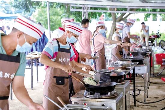 ■在云浮市郁南县东坝镇双凤村举行了一场“粤菜师傅”职业技能鉴定考试,贫困户叶培荣走进考场,对做好腐竹焖鱼、罗定豆豉鸡、肉丝炒面三道“考题”显得胸有成竹。 |