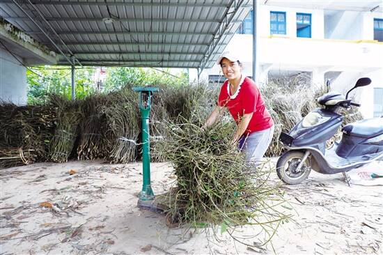 ■家住云浮市郁南县平台镇中村村的贫困户卢舒艮骑着摩托车载着一捆50多斤重的桂枝,送到村里的玉桂加工基地去卖。 |