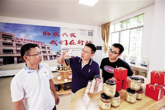 ■阳江市阳东区北惯镇彭村村的“小彭家作”电商展示厅里,中远海运特种运输股份有限公司驻彭村村第一书记莫非梁与同事检视着货架上陈列的商品。 |