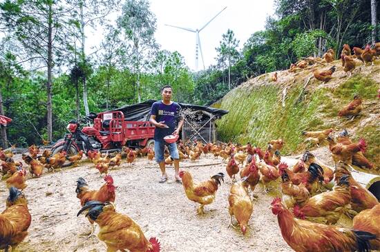 ■阳江市阳东区新洲镇那六村的贫困户胡思南在自己的养殖场喂鸡。 |