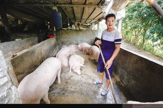 ■在阳江市阳东区新洲镇屋地村,刘兴国正在猪圈里打扫卫生。 |