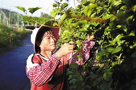 ■在茂名市高新区七迳镇张屋村的黄金百香果种植基地里,贫困户黄小玲在给百香果剪枝。 |