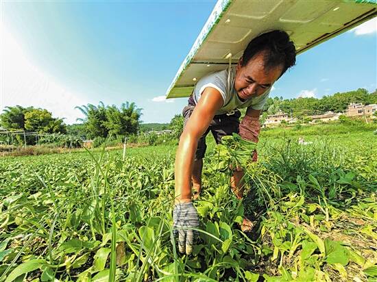 ■通衢镇旺宜村的南越绿宝农业蔬菜生产基地,工人正在摘菜,背上轻便的白色泡沫板为他防晒。 |