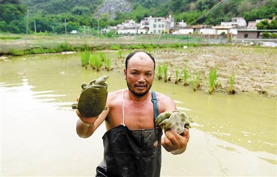 ■九龙镇寨背村水上养香米水稻、水下养鱼鳖的“生态立体养殖”基地里,养殖人员在工作。 |