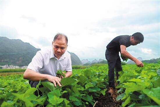 ■桑芽菜是九龙镇寨背村今年新引进的扶贫产业项目,驻村第一书记曾国伟带着村干部收桑芽菜。 |
