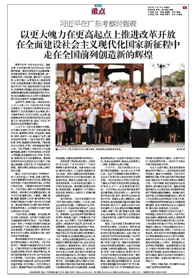 据新华社电 中共中央总书记、国家主席、中央军委主席习近平近日在广东考察时强调,要坚决贯彻党中央战略部署,坚持新发展理念,坚持高质量发展,进一步解放思想、大胆创新、真抓实干、奋发进取,以更大魄力、在