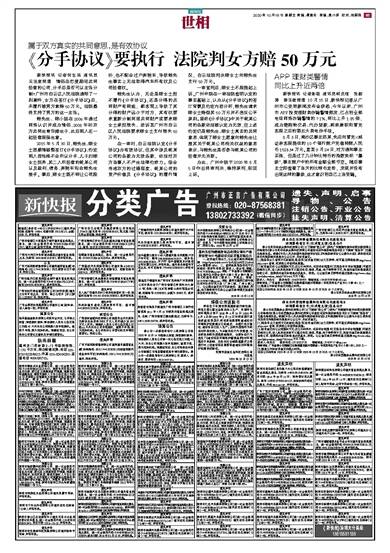 新快报讯 记者何生廷 通讯员云法宣报道 情侣在恋爱期间共同经营的公司,分手后是否可以主张分割?广州市白云区人民法院通报了一则案件,女方在签订《分手协议》后,未履行被男方索赔50万元。法院最终支持