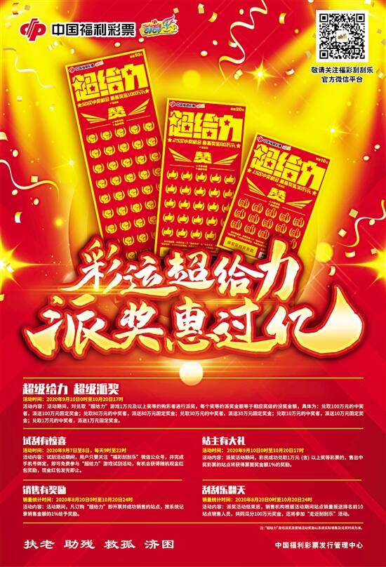 “彩运超给力,派奖惠过亿”,中国福利彩票发行管理中心自2020年9月10日起针对全国联销的“超给力”系列即开型福利彩票游戏开展1.5亿元派奖;为配合活动开展,广东福彩在全省(不含深圳)同步开展“中1000元再送1000元‘超给力’系列即开票”配套赠票活动。目前,两个活动正在火热进行中。截至10月14日,带动全省(不含深圳)刮刮乐即开票销售2.25亿元,筹集公益金4512.76万元! ■新快报记者 陆妍思 通讯员 莫冠婷 全国1.5亿元派奖“超给力” 活动延长至10月30日 刮刮乐“超给力”即开票是由中福彩中心设计推出的全新票种,票面标题设计大气有力度,极具冲击感。色调整体由红、金构成,直击重点,简洁明快,主题突出。“超给力”为系列票,分为10元、20元与50元三款面值,对应头奖分别是30万元、80万元和100万元。玩法统一采用目前最受彩市欢迎的“对数字+特殊图符”玩法,简单易上手。 为配合“超给力”上市,中福彩中心在全国开展“彩运超给力,派奖惠过亿”1.5亿元大派奖,内容包括:自2020年9月10日0时起,在活动期间,凡是兑取“超给力”游戏1万元及以上奖等的购彩者都可以获得额外的翻倍奖金。具体为:兑取100万元的中奖者,派送100万元固定奖金;兑取80万元的中奖者,派送80万元固定奖金;兑取30万元的中奖者,派送30万元固定奖金;兑取10万元的中奖者,派送10万元固定奖金;兑取1万元的中奖者,派送1万元固定奖金。 由于活动开展以来,深受广大彩民朋友的欢迎和喜爱,为回馈广大彩民一直以来对福利彩票的支持,给彩民预留充裕的购彩和兑奖时间,中福彩中心决定延长“超给力”系列即开型彩票游戏派奖活动时间。“超给力”系列即开型彩票游戏派奖截止时间由原来的10月20日17时调整为10月30日17时,派奖规则等内容维持不变。若延长派奖期内派奖奖金派发完毕,派奖活动自然截止。 广东已摘派奖金额637万 广州东莞各摘160万 派奖活动开展以来至10月14日,广东(不含深圳)各地幸运儿获得10元、20元、50元三个面值总派奖金额为637万元。其中,10元面值中出6个一等奖,分别是潮州2个,广州、汕尾、佛山、茂名各1个,每位幸运儿除获得30万元兑奖奖金外,更获得加奖奖金30万元。20元面值中出2个一等奖,分别花落广州、东莞,每位幸运儿除获得80万元兑奖奖金外,更获得加奖奖金80万元。50元面值暂未中出一等奖(每个100万元),但中出10个二等奖(每个10万元),分别是东莞、潮州各2个,广州、珠海、佛山、韶关、河源、惠州各1个。 广东加推“中1000送1000” 已送出赠票330万元 广东福彩在“超给力”系列即开票全国统一营销的基础上,配套开展“中1000送1000”活动。具体为:凡购买广东省(不含深圳)刮刮乐即开票单张彩票中得1000元奖级且在开展赠票活动时段内(2020年9月10日0时兑奖的即开票参加本次赠票活动)兑奖的中奖者,赠送价值1000元的整本“超给力”系列即开票。 广东开展赠票活动以来(数据截止至10月14日),目前符合活动规则成功登记并领取赠票的共有3300名幸运儿,赠票金额达330万元。 当活动合计赠送的刮刮乐即开票金额累计达到500万元时,广东福彩中心将向社会公告本次活动结束,赠票领取截止时间为公告活动结束次日21时30分。
